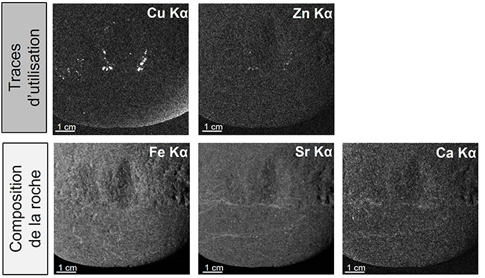 La précision analytique permise par cette analyse Sy-XRF, grâce notamment aux cartographies de distribution des différents atomes, avec une résolution choisie de quelques dizaines de micromètres, permet de bien distinguer des éléments chimiques relevant des minéraux composant les roches hétérogènes, généralement utilisées pour les outils en pierre, des résidus des matières transformées piégées à la surface. La cartographie XRF a ainsi permis de montrer que des résidus de matières cuivreuses étaient associés aux traces microscopiques liés à l’utilisation des outils en pierre.