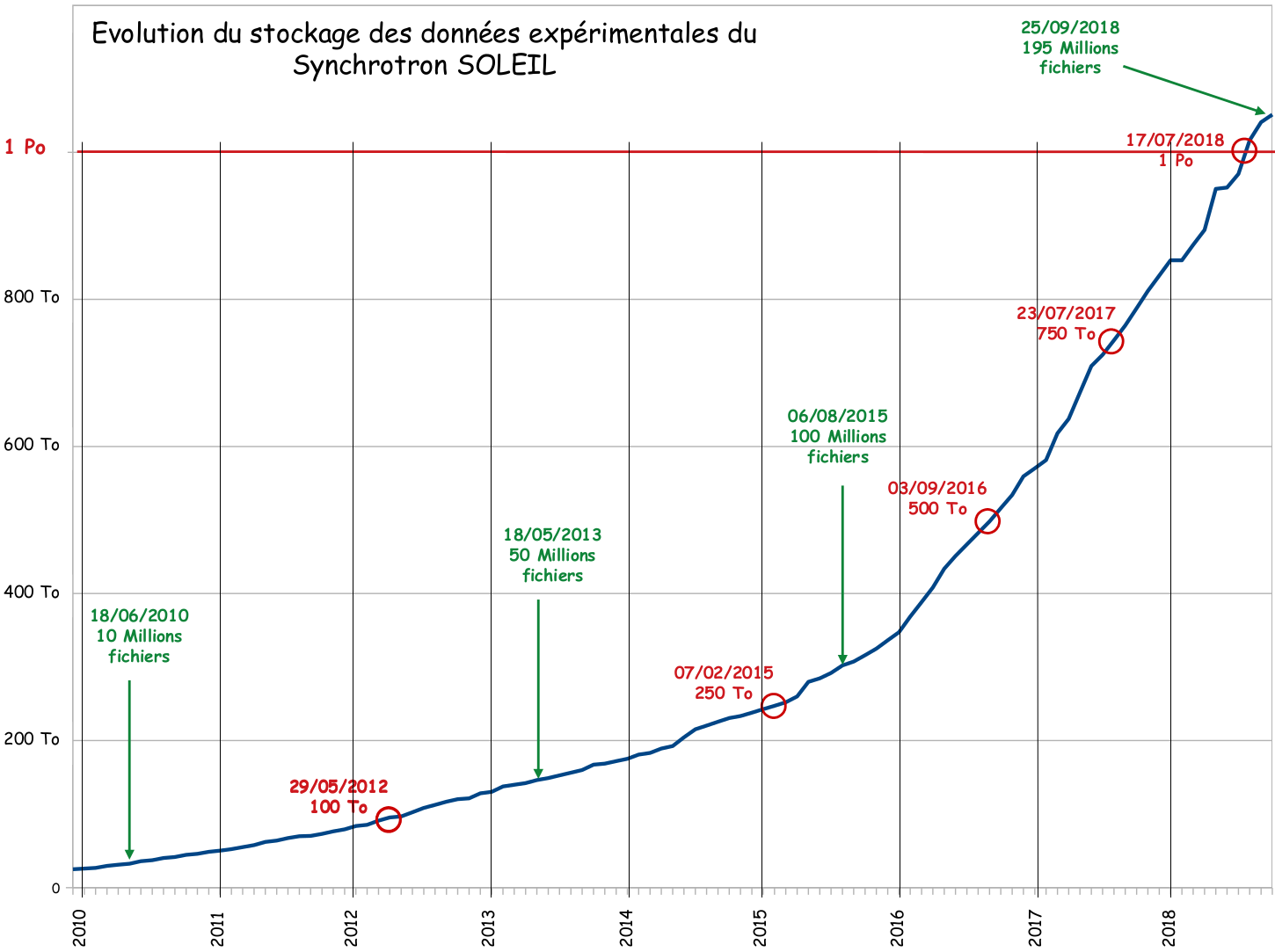 A SOLEIL, la progression a été régulière sur ces 10 dernières années, avec une accentuation très significative ces 3 dernières années depuis l’arrivée des derniers détecteurs haute performance et des techniques d’acquisition multi-détecteurs. En date du 20 septembre 2018, le volume stocké est de 1,05 pétaoctets pour 195 millions de fichiers, soit une moyenne d’environ 5 mégaoctets par fichier.