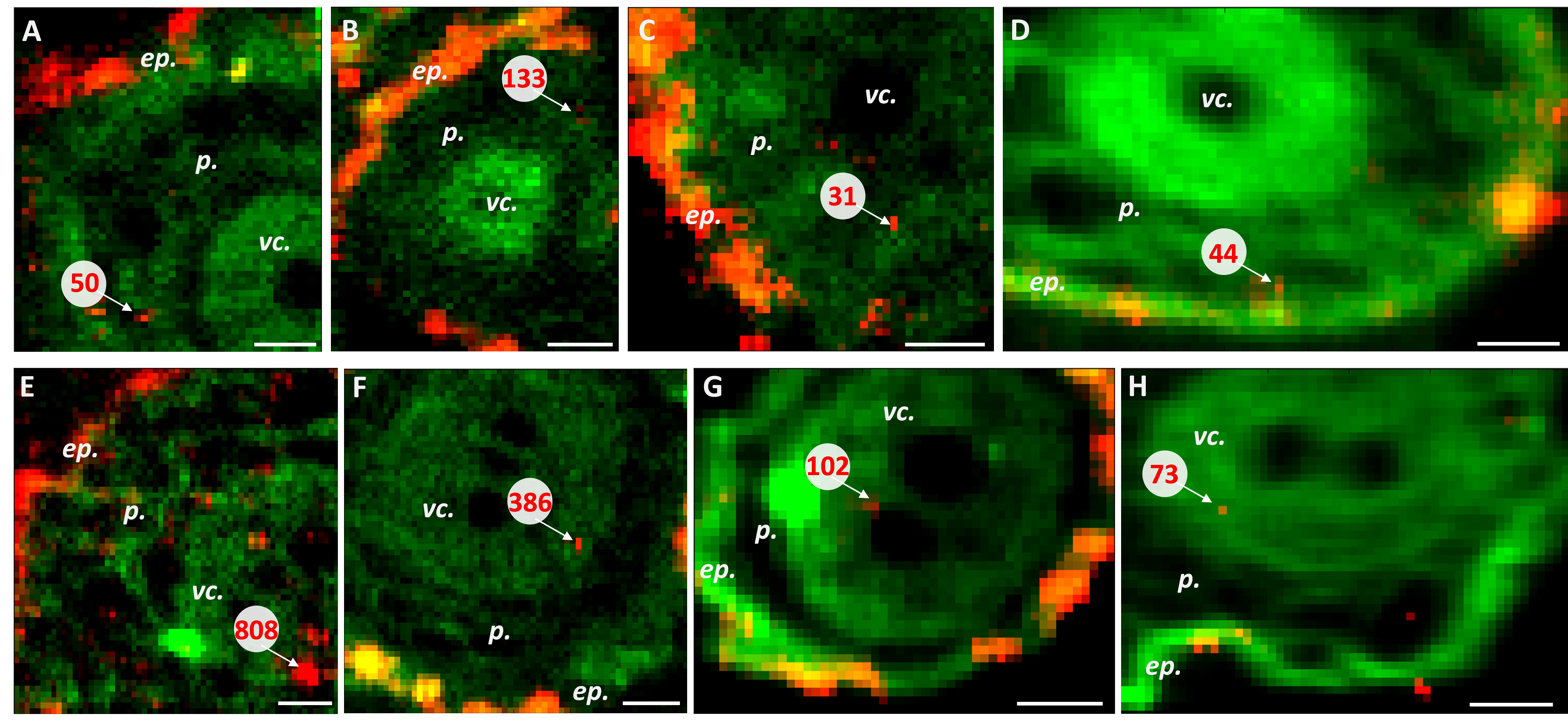 Pour comprendre le rôle du sol, du blé, une céréale très cultivée dans le monde, a été exposé à des nanoparticules de TiO2 (0, 100, 500 mg·kg−1) dans 4 types de sols différents. Après plusieurs semaines d’exposition, la quantité de Ti a été mesurée dans le sol, les lixiviats1 et les feuilles de blé. La distribution du Ti dans les racines et les feuilles et la forme sous laquelle le Ti est présent (spéciation) dans les feuilles (complexation avec d’autres molécules, par exemple) a également été déterminée en utilisant des techniques d’analyse disponibles sur LUCIA (microspectrocopie de fluorescence X et micro XANES) et au LEEL (micro-émission X induite par particules, µPIXE, et Spectroscopie de rétrodiffusion de Rutherford, RBS, qui est adaptée à l’étude des éléments légers, type C, N, O).