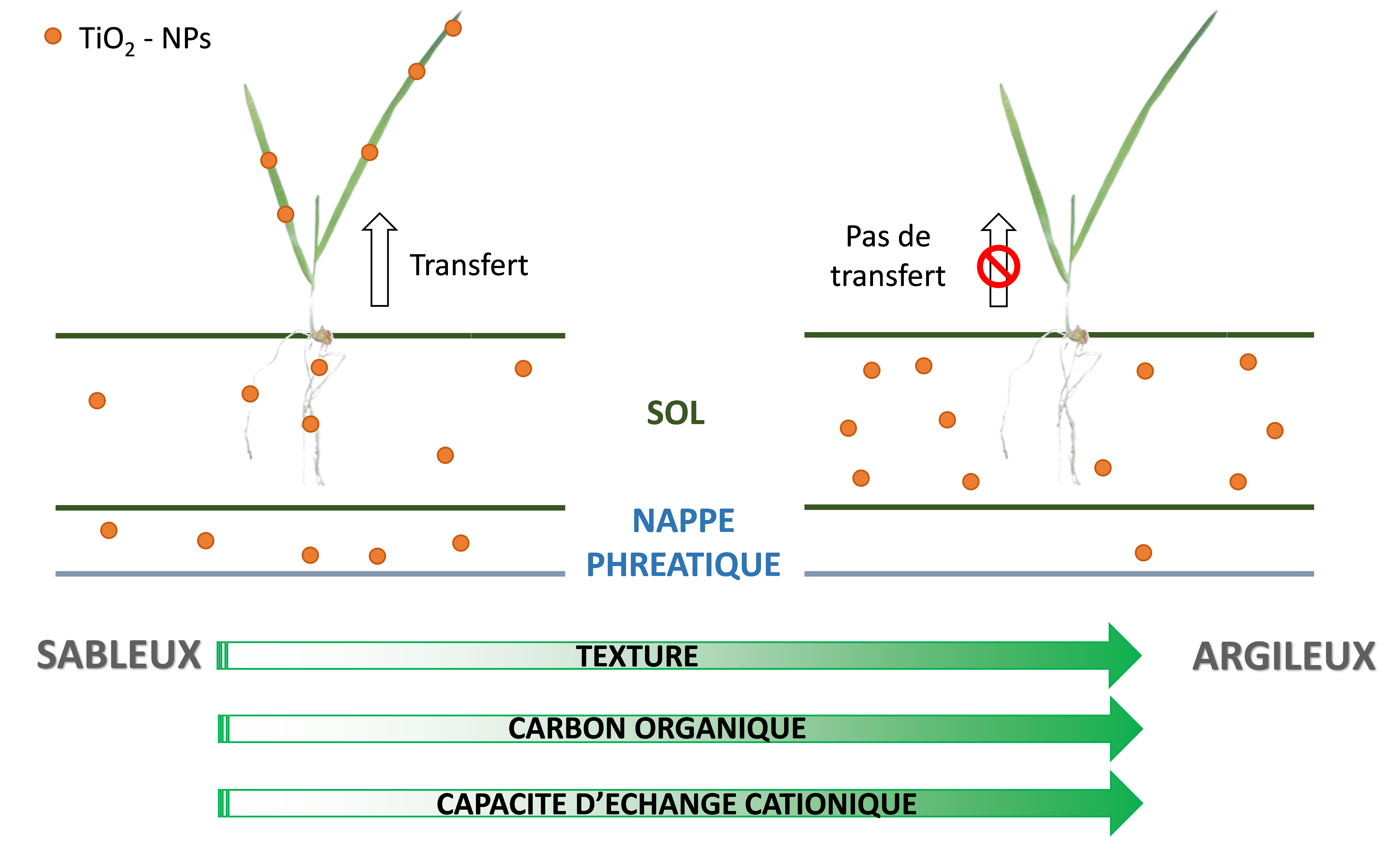 En conclusion générale, pour les agro-systèmes, la contamination en nanoparticules de TiO2 (après une courte période d'exposition : 3 semaines) semble avoir peu d'impact sur la santé de la plante et entrainer un faible risque de transfert vers les plantes ou les aquifères (Figure 2).