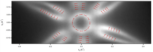 Tout d’abord pour vérifier si la carte d’intensité des états de surface reflète les symétries du cristal. Les composés Bi1-xSbx présentent une surface à réseau hexagonal : en effet, on observe bien une surface de Fermi en forme de fleur à six pétales au cœur hexagonal. Ensuite, et surtout, parce que la théorie prévoit que cette surface de Fermi doit présenter une texture de spin, c’est-à-dire un arrangement régulier représenté sur la figure 1 par les flèches rouges, qui symbolisent la direction des spins pour les états électroniques observés. Les spins s’enroulent dans un sens sur le cœur hexagonal et dans le sens inverse sur les pétales. Cette texture doit permettre une conversion courant de charges-courant de spins très efficace : le passage d’un courant « classique » (de charges) dans une direction doit générer un courant polarisé en spin dans la direction perpendiculaire.