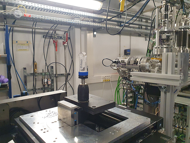 Figure 3 : dans la station de travail de la ligne PSICHÉ, préparation minutieuse du scan en microtomographie X d'une tablette de défixion (© SAVO, 2025).