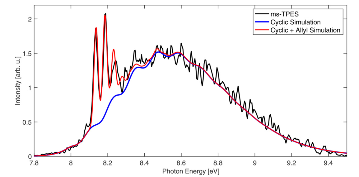 Par ailleurs les scientifiques ont, grâce à des calculs innovants basés sur la propagation des paquets d’onde vibrationnels dans les surfaces d’énergie potentielle du cation, modélisé les spectres théoriques d’émission de photoélectrons attendus pour le cation cyclopropyle, mais aussi sa forme linéaire (allyle) qui est produite par ouverture du cycle (figure 2).
