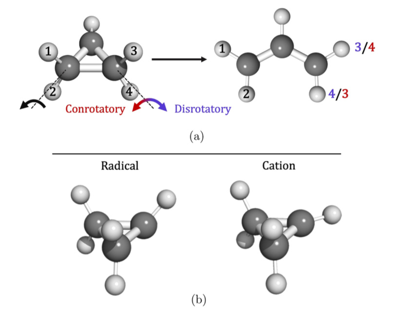 L'accord étroit entre l'expérience et la théorie a aussi permis de conclure sans ambiguïté que la forme cyclique du cation n'existe en fait pas en tant qu'espèce stable, mais qu'il s'agit plutôt d'un état de transition vers le cation linéaire. Ainsi, le radical cyclopropyle existe en raison des barrières cinétiques à l’ouverture du cycle, qui ne sont pas présentes dans l’ouverture disrotatoire du cation (voir figure 3), ce qui règle une question fondamentale remontant aux premières théories des réactions péricycliques (réactions au cours desquelles une molécule passe par un état de transition en ayant une géométrie cyclique).