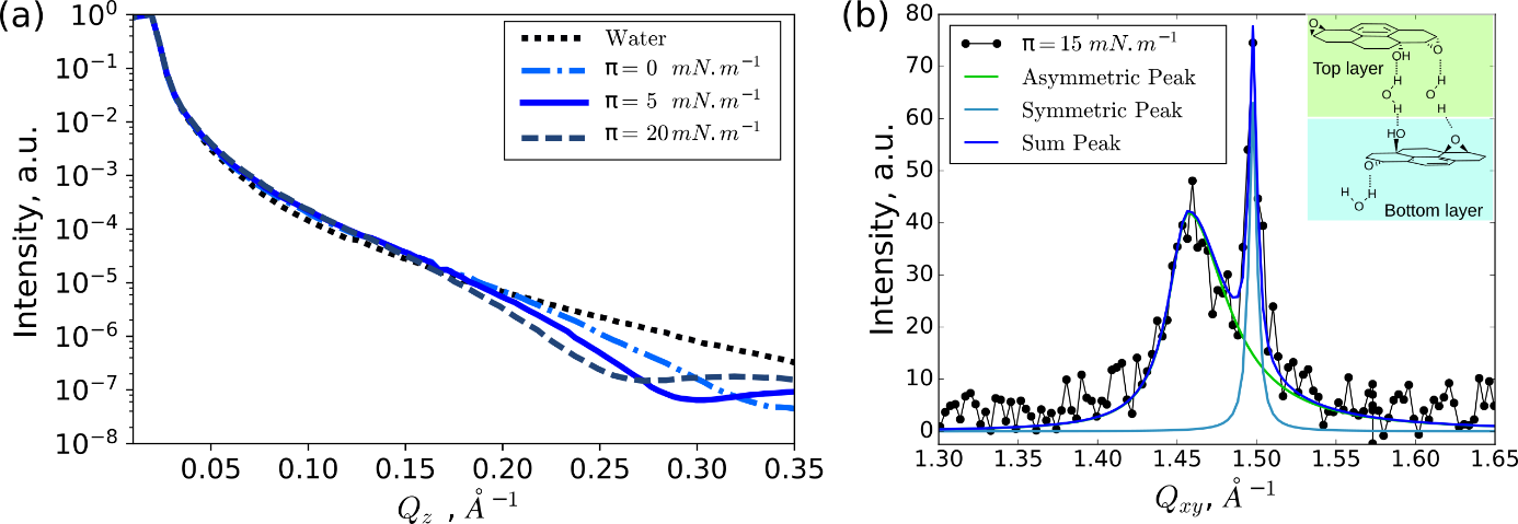 Les chercheurs ont étudié ces films d’oxyde de graphène à la surface de l’eau à l’échelle microscopique par des mesures de Diffraction des rayons X rasants (GIXD) sur la ligne de lumière SIRIUS à SOLEIL, couplées à des mesures de réflectivité X (XRR) sur la ligne ID10 de l’ESRF. Ces mesures sont présentées en Figure 2. L’épaisseur d’un feuillet d’oxyde de graphène en milieu humide est de l’ordre de 10 Å. Cependant, les spectres de réflectivité ne peuvent être ajustés que par une couche d’épaisseur de 20 Å pour toutes les valeurs de pression. Ceci indique que le film déposé à l’interface eau-air est formé d’une bicouche de feuillets (modèle présenté en insert de la Figure 2 (b)). Les mesures de GIXD confirment cette hypothèse. En effet, les formes des deux pics de diffraction observés pour des pressions superficielles non nulles traduisent la présence de deux structures différentes, l’une formée par des feuillets parallèles à la surface de l’eau (pic symétrique), l’autre par des feuillets désorientés par rapport à cette surface (pic asymétrique). Cette structure en bicouche se comprend par la présence de molécules d’eau intercalées reliées aux feuillets de chaque couche par des liaisons hydrogène. Quand la bicouche est comprimée, les feuillets parallèles et en contact avec la surface de l’eau atteignent rapidement une densité forte tandis que ceux de la couche supérieure se désorientent progressivement.