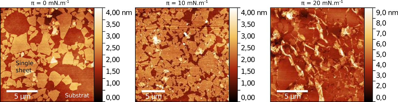 Les mesures de diffusion de rayons X sur surface liquide ont donc permis d’interpréter la courbe de la Figure 1. La réflectivité X révèle la présence de deux couches différentes et la diffraction des rayons X rasants révèle la désorientation des feuillets dans l’une de ces couches. On observe donc sur l’eau la formation spontanée d’une bicouche de feuillets d’oxyde de graphène. Durant la compression, les structures des deux couches se différentient. Cependant, les observations par AFM d’un film transféré indiquent une épaisseur correspondant plutôt à une monocouche (Figure 3). Ceci démontre que le mécanisme de transfert est plus complexe pour ce système que pour les monocouches de Langmuir « classiques ». Une différence de la nature amphiphile des différents feuillets qui composent chacune des couches pourrait expliquer ce phénomène.