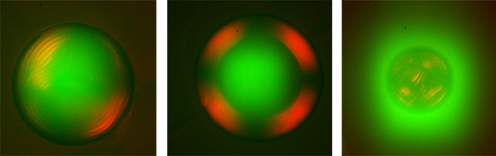 Figure 2 : Images composites obtenues par microscopie DUV de gouttelettes de CNC + protéine GH7 ou BSA. En vert : autofluorescence émise par les protéines GH7 ou BSA. En rouge : biréfringence caractéristique de l’auto-organisation des CNC. À gauche, gouttelette CNC + GH7 ; au centre : après un temps de repos suffisant, on observe les CNC auto-organisés dans une gouttelette GH7+CNC. À droite : CNC + BSA, qui a diffusé dans les micelles autour de la gouttelette restant désorganisée.