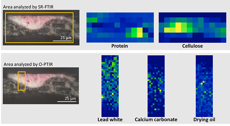 Ces résultats montrent aussi la présence d'huile de séchage, de blanc de plomb et de carbonate de calcium dans la couche de peinture. De manière complémentaire, l'analyse du même échantillon par OPTIR a révélé la distribution des pigments à l’intérieur des couches de peinture du tableau, montrant la dissémination hétérogène du blanc de plomb et du carbonate de calcium. La présence de particules de laque géranium, probablement associées à la couleur rouge observée dans l’arrière-plan, n’a pu être détectée qu’à la résolution plus fine de la technique OPTIR.