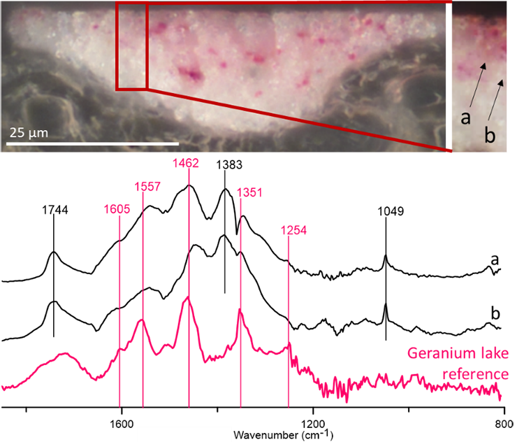 En bas : spectres O-PTIR relevés à chaque point et spectre de référence de la laque géranium obtenu par la même technique. Les pics marqués en rose correspondent à la laque géranium.