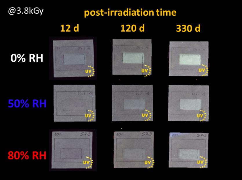 Un comportement différencié sous faisceau en rapport avec l’humidité contenue dans le papier a été mis en évidence. Les changements les plus importants en termes de luminescence sous UV (figure 1) et de dépolymérisation (figure 2) ont été mesurés pour les échantillons de papier les moins humides, c’est à dire ceux irradiés à 0% d’humidité relative (HR). Une des conclusions de la recherche est donc qu’il est important de veiller à ne pas laisser le matériau se dessécher durant l’analyse SR-X.