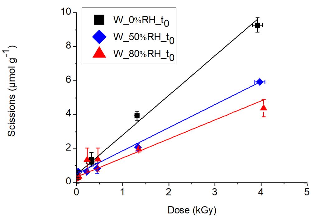 Les indicateurs les plus directs de la dégradation de la cellulose sont la dépolymérisation et l’oxydation. Agissant ensemble, ces mécanismes réactionnels conduisent à un raccourcissement des chaînes moléculaires, et, à terme un affaiblissement mécanique des fibres. Ces « évènements » chimiques conduisent à d’autres manifestations, physiques, telles que l’apparition de luminescence sous UV et du jaunissement. Ces modifications post-irradiation du papier ont été suivies grâce à des techniques séparatives et de spectro-imagerie qui ont permis de sonder sur une large échelle spatiale, nanométrique (moléculaire) et microscopique. À l’échelle nanométrique, la dépolymérisation de la cellulose a été évaluée par chromatographie d’exclusion stérique (SEC-MALS-DRI) et la formation de radicaux libres (notamment hydroxyles), témoins de phénomènes d’auto-oxydation, par chromatographie liquide haute performance (HPLC-FLD-DAD). À l’échelle microscopique, la luminescence sous UV et le jaunissement ont été mesurés par spectrométrie et photographie. Un moyen d’estimation des doses absorbées par le papier a été mis en place afin de connaître celles qui induisent des modifications, avec une attention particulière à la détermination du niveau de plus faible effet néfaste observé (Lowest Observed Adverse Effect Dose ou LOAED). Un suivi temporel des propriétés physico-chimiques du papier a été mis en place sur une durée de deux ans.