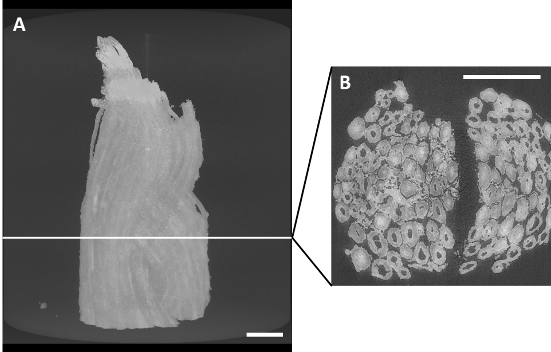 Des fibres cellulosiques prélevées sur des textiles, exceptionnellement conservées et exhumées à proximité d’objets en cuivre, ont été imagées par µ-CT sur la ligne de lumière ANATOMIX. Les sections et volumes virtuels 2D ou 3D (FIG. 2), avec une résolution spatiale inférieure à 1 µm, permettent d’apprécier l’histologie des fibres ainsi que certaines altérations comme des microfissures.
