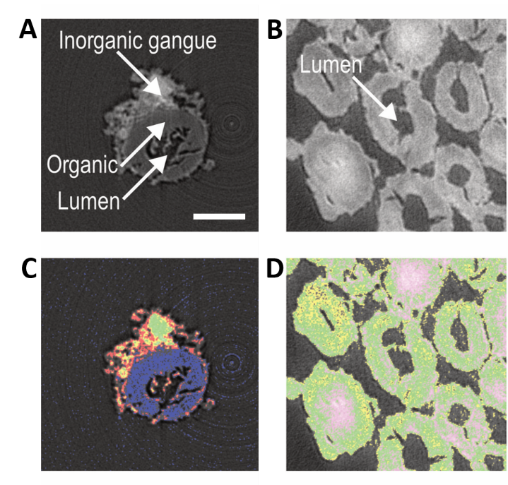 (C et D) Images obtenues par segmentation des sections virtuelles montrant la distribution des principales phases en présence (bleu, phase organique ; rouge, phase constituée de composés solubles de calcium, de silicium et de cuivre ; jaune, vert et violet, silicates de cuivre). Barre d'échelle : 20 µm.