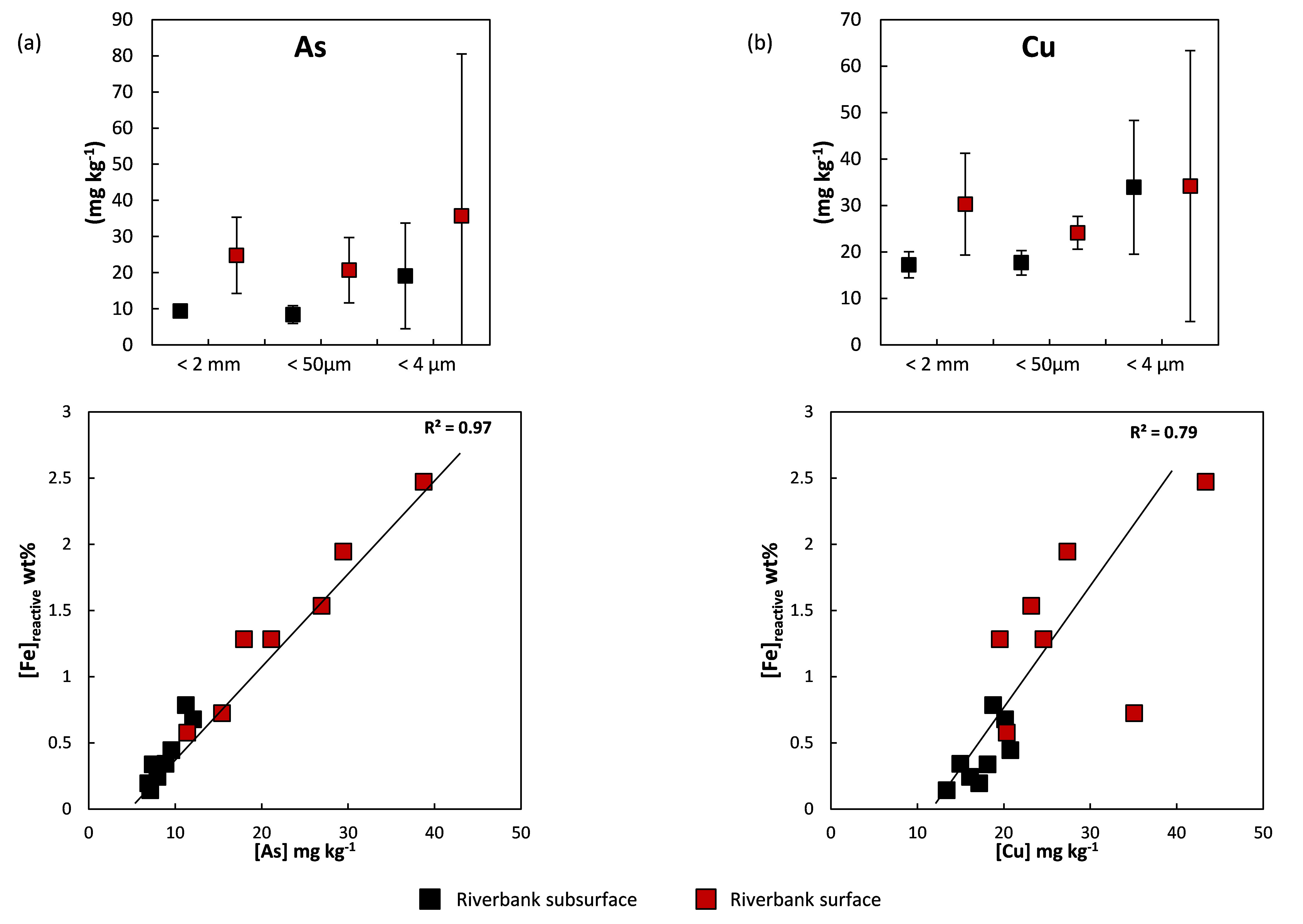 La différence de spéciation du Fe à cette interface est primordiale pour le devenir des ETM puisque tout le Fe présent sur ces berges ne présente pas les mêmes propriétés. En effet, en raison de leur très petite taille et de leur faible cristallinité, la ferrihydrite (oxyhydroxyde de fer amorphe) et les associations Fe-matière organique sont les principaux responsables de la sorption des éléments chimiques, ils sont nommés ici Fe-réactif. Une corrélation linéaire existe entre la teneur en Fe-réactif et les concentrations totales de l’essentiel des ETM. Les échantillons de surfaces des berges possèdent les plus hautes teneurs en Fe-réactif et en métaux associés. Deux exemples représentatifs de comportement de métaux sont donnés Figure 3 : arsenic (As) et cuivre (Cu).