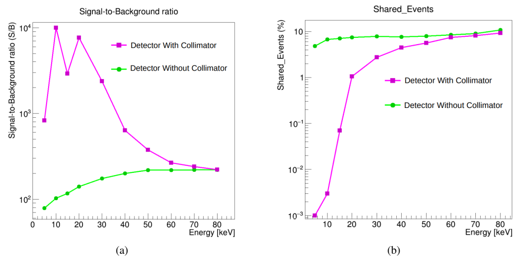 Comme attendu, les premiers résultats obtenus en simulation (voir Figure 2) montrent une réduction des événements de partage des charges et une augmentation du rapport S/B pour les rayons X dont l'énergie est inférieure à 30 keV si le détecteur est équipé d'un collimateur, alors qu'une faible différence entre les deux configurations de détecteur est observée à une énergie plus élevée. Il faut noter que la zone de détection est augmentée de 30% en l'absence de collimateur, ce qui représente une amélioration significative pour les expériences futures si les événements de partage des charges peuvent être gérés.