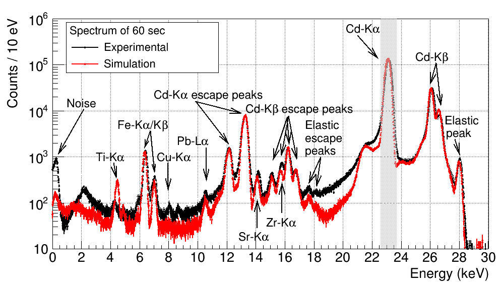 Des données expérimentales obtenues sur SAMBA en 2020 et 2021 ont été utilisées également pour calibrer et valider la chaîne de simulation. Dans l'expérience XRF réalisée, un faisceau d'une énergie de 28 keV a été focalisé sur un échantillon de référence riche en cadmium, situé à 45 degrés entre le faisceau et le détecteur. La comparaison des spectres en énergie mesurés et simulés (voir Figure 3) montre un bon accord, en particulier pour les principales raies de fluorescence (cadmium, fer, etc.). Quelques différences ont été observées au niveau du signal Compton créé par la raie du cadmium et la présence des raies de fluorescence du titane provenant du collimateur, et elles seront corrigées à l'avenir avec une modélisation plus précise du détecteur.