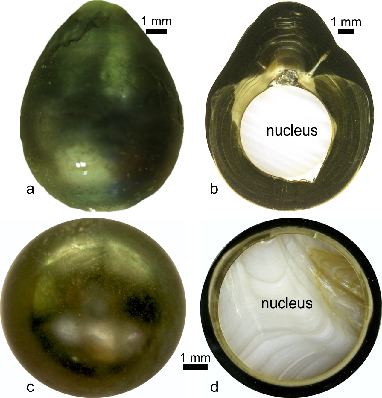 Inventées au Japon au début du 20° siècle, les perles de culture sont obtenues par une “greffe”. Un petit fragment (le greffon) de l’organe produisant la nacre de la coquille d’une “huître” perlière (Pinctada, qui n’est pas vraiment une huître) est implanté dans un autre animal de la même espèce. Il y est placé contre une petite sphère (nucleus, en nacre, Fig. 1) préalablement introduite dans la gonade de l’huître “porteuse”. Si la greffe est un succès (le taux de perte est élevé), le greffon survit, enveloppe le nucleus et après environ deux ans, la perle est prélevée et classée en fonction de ses qualités. Une sévère sélection est nécessaire car, contrairement aux descriptions habituelles, le nucleus n’a pas été simplement recouvert d’une couche de nacre. Beaucoup de perles sont irrégulières, mais toutes montrent une histoire complexe (Fig. 1). Cette analyse détaillée des structures internes des perles et de leur composition donne un accès direct au processus de biominéralisation qui s’est déroulé entre la greffe et la récolte.