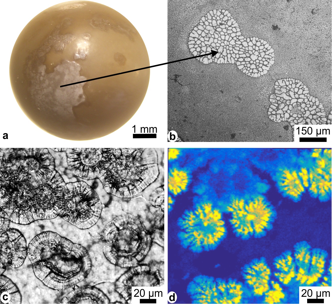 La coupe de plusieurs centaines de perles a permis la corrélation des données structurales (micro- et nano-échelles par microscopies et micro-tomodensitométrie), minéralogiques (spectrométries Raman et infra-rouge), chimiques (microsonde électronique, spectroscopie de structure près du front d'absorption de rayons X et nano-fluorescence par rayons X). Elle révèle que chaque perle, ronde ou non, a sa propre structure et composition. Les structures anormales (qui perturbent la sphéricité) sont produites dès le début du développement de la perle, montrant que la greffe a fortement perturbé la production des composés organiques contrôlant le processus de bio-cristallisation. La perturbation est parfois si intense qu’outre les structures connues dans les coquilles (nacre aragonitique et prismes calcitiques), des structures jamais produites dans les coquilles de cette espèce sont observables (prismes aragonitiques par exemple). Quelques jours après la greffe, les irrégularités sont visibles (Fig. 2a, b). Des zones plus ou moins grandes, de formes variables comportent déjà des éléments minéraux, tandis que d’autres sont encore entièrement organiques. Grâce à la résolution nanométrique de NANOSCOPIUM, la présence de zones minéralisées sur des échantillons ayant un mois ou moins apparaît clairement sur les cartographies (Fig. 2c, d). La distribution des éléments associés au carbonate de calcium (calcite et aragonite) correspond à la disposition à la fois radiaire et concentrique du Ca.