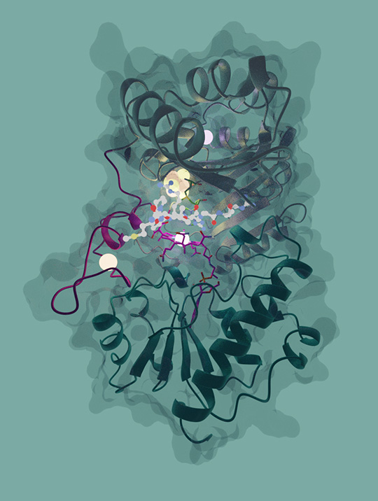 En outre, pour la première fois, il a été possible de prendre plusieurs « photographies » de la Mmp10 à différentes étapes de la réaction, c’est-à-dire d’obtenir les structures 3D de l’enzyme dans les différentes conformations qu’elle adopte successivement au cours de la réaction qu’elle catalyse. Les scientifiques ont ainsi pu capturer l'enzyme en mouvement et reconstituer un « film » de la réaction. Grâce à cette approche élégante et multidisciplinaire, il a été possible de démontrer que l'enzyme subit des réarrangements jusqu’ici jamais observés, principalement dans son site actif, au cours de la catalyse.