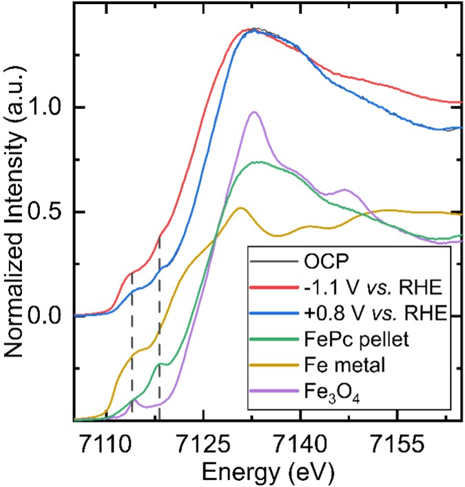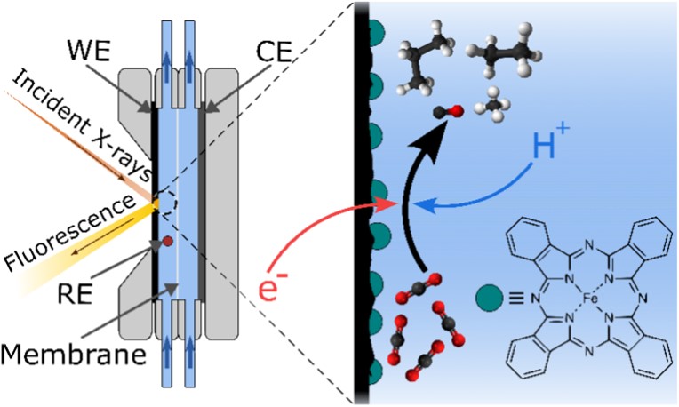 Afin de réaliser la réduction électrocatalytique du CO2, la phthalocyanine de fer (FePc) a été sélectionnée. Il s’agit d’un catalyseur disponible commercialement et uniquement composé d’éléments abondants : carbone, azote, hydrogène et fer. Ce catalyseur a été déposé sous la forme d’un film mince sur une électrode de carbone puis inséré dans une cellule d’électrolyse à circulation (voir figure 1), laquelle permet également de réaliser des expériences de spectroscopie d’absorption des rayons X au cours de la catalyse. Dans des conditions optimales, FePc produit du monoxyde de carbone (CO) à hauteur de 80%, complété par de l’hydrogène (H2) pour les 20% restants.