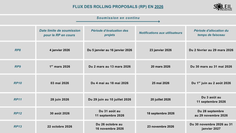 Il y a deux appels à projets par an et le temps de faisceau alloué aux utilisateurs est effectué dans un créneau de 6 mois consécutifs aux décisions des comités de programmes.