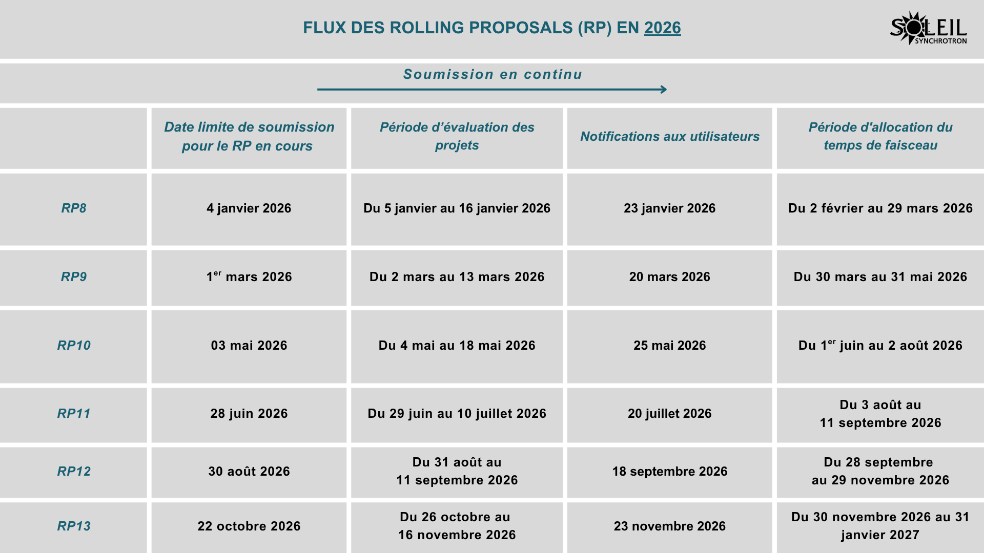 Dépôt de projet en continu, avec évaluation tous les deux mois pour les groupes ayant besoin de temps de faisceau pour un seul projet.