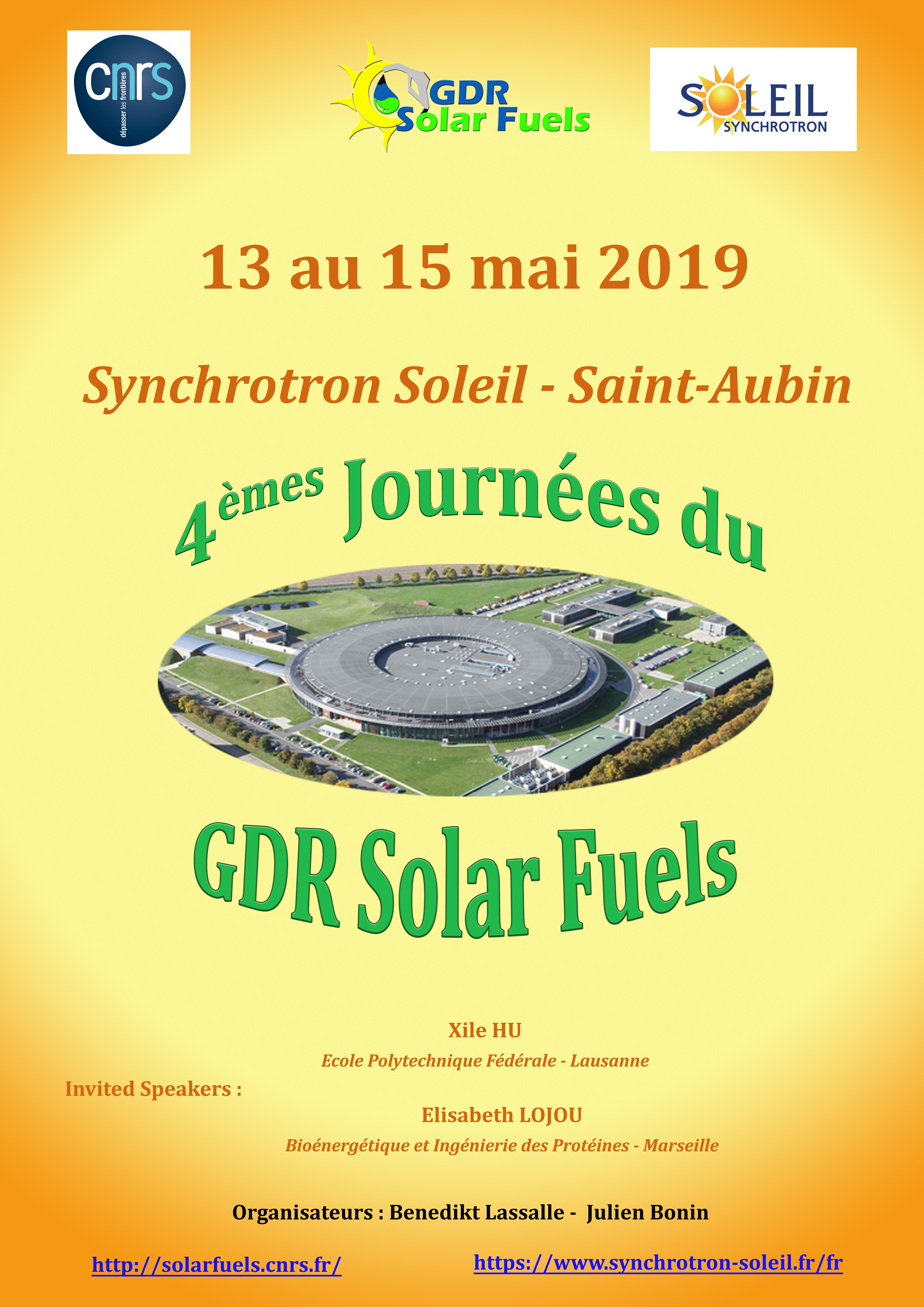 Les 4èmes Journées Nationales des Carburants Solaires, rendez-vous annuel du groupe de recherche (GDR) Solar Fuels réunira les chercheuses et chercheurs de ce domaine au sein du Synchrotron SOLEIL, du 13 au 15 Mai 2019.